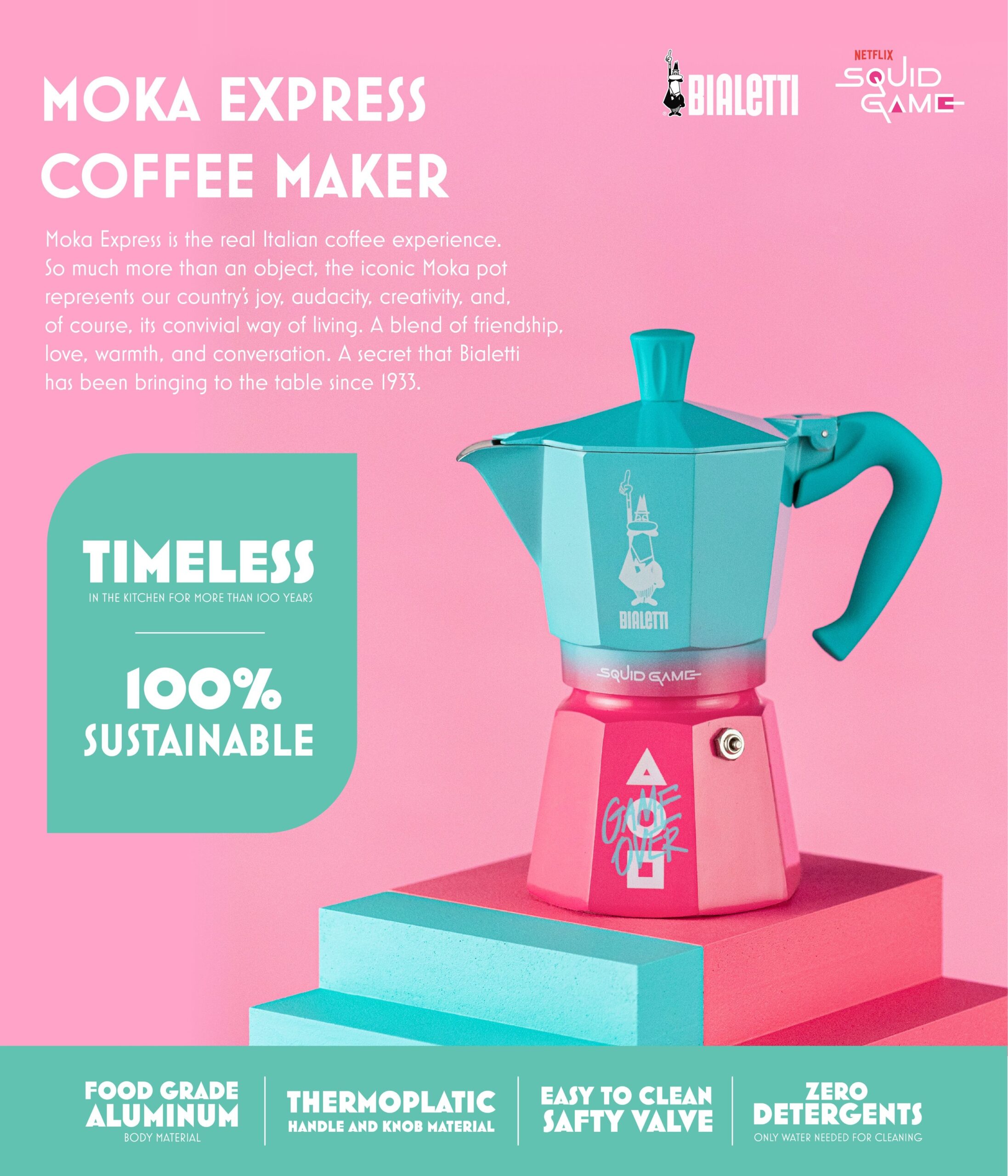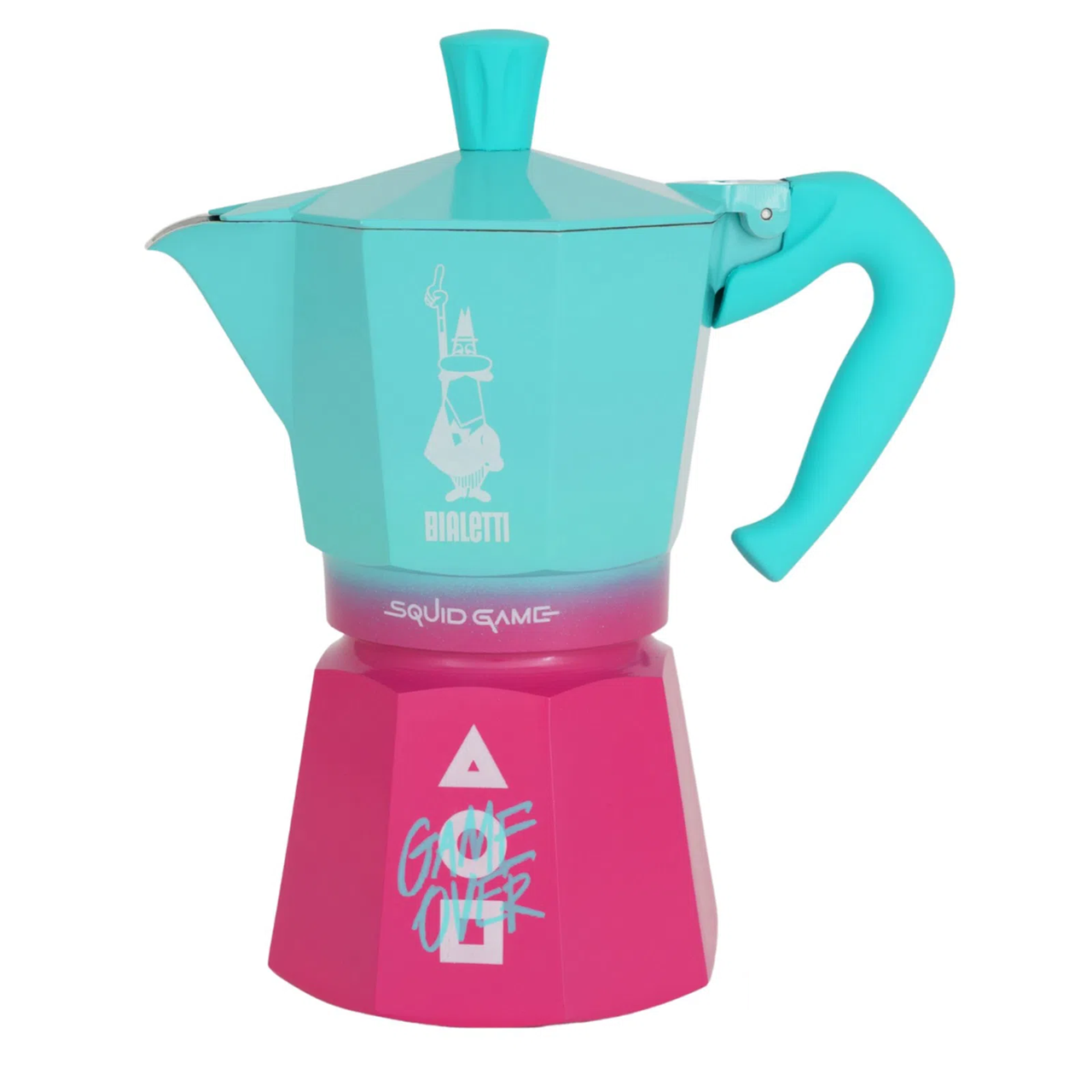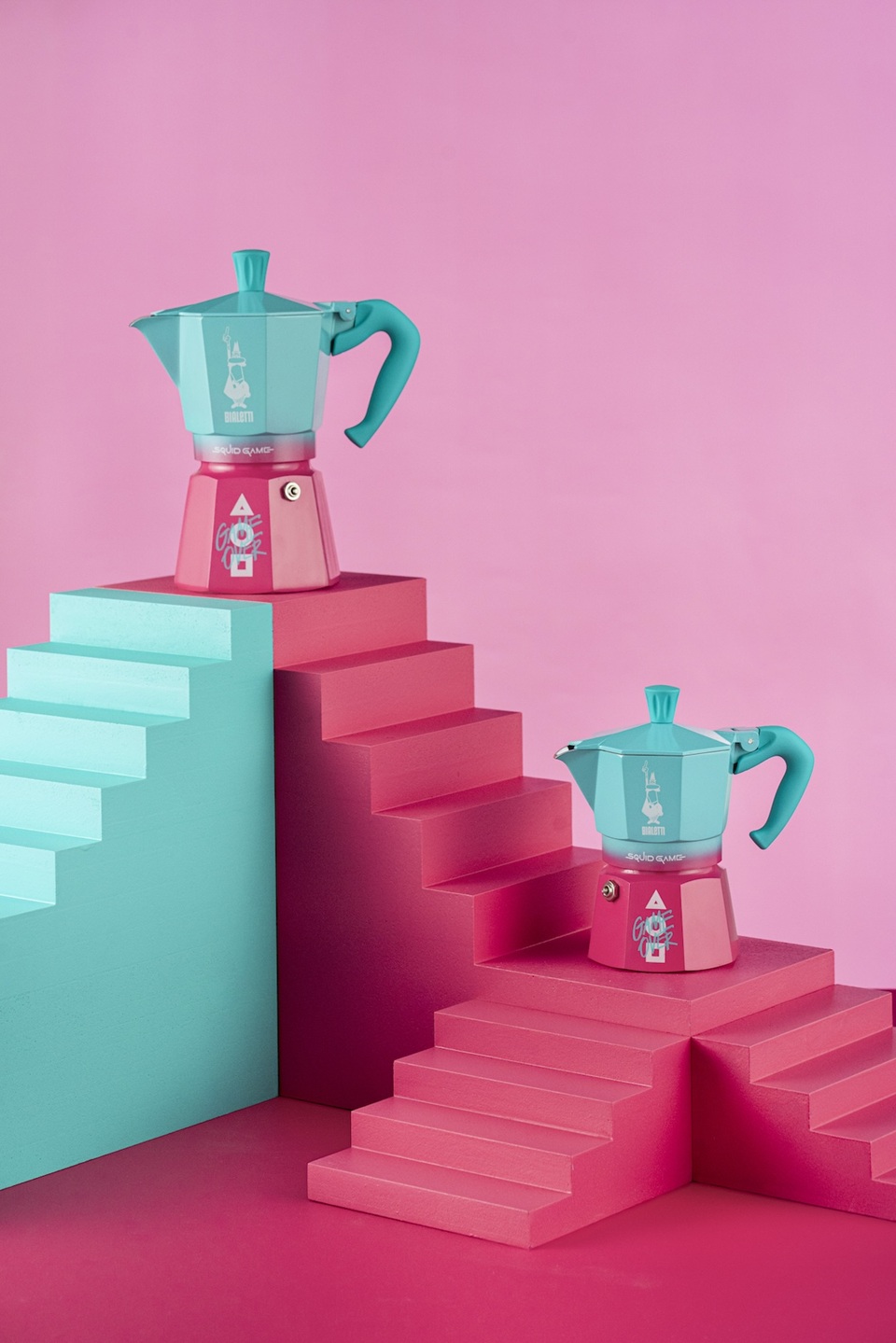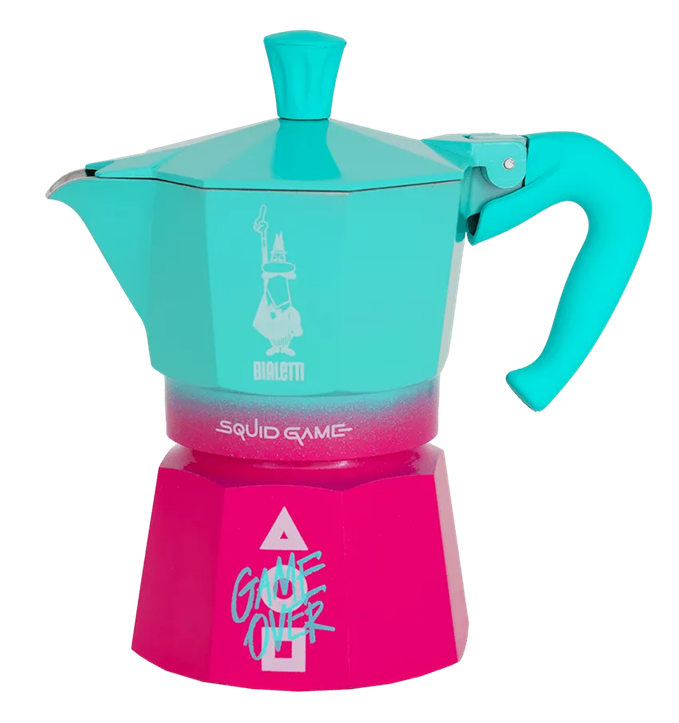 Moka Express Squid game je limitovanou edicí moka konviček Bialetti, jež vznikla přímou spoluprací značky Bialetti se společností Netflix. Design konviček kombinuje růžové a azurové pozadí s bílým logem Squid Game a ikonickou trojicí tvarů (trojúhelník, čtverec, kruh), které vycházejí z původní podoby loga v korejštině.